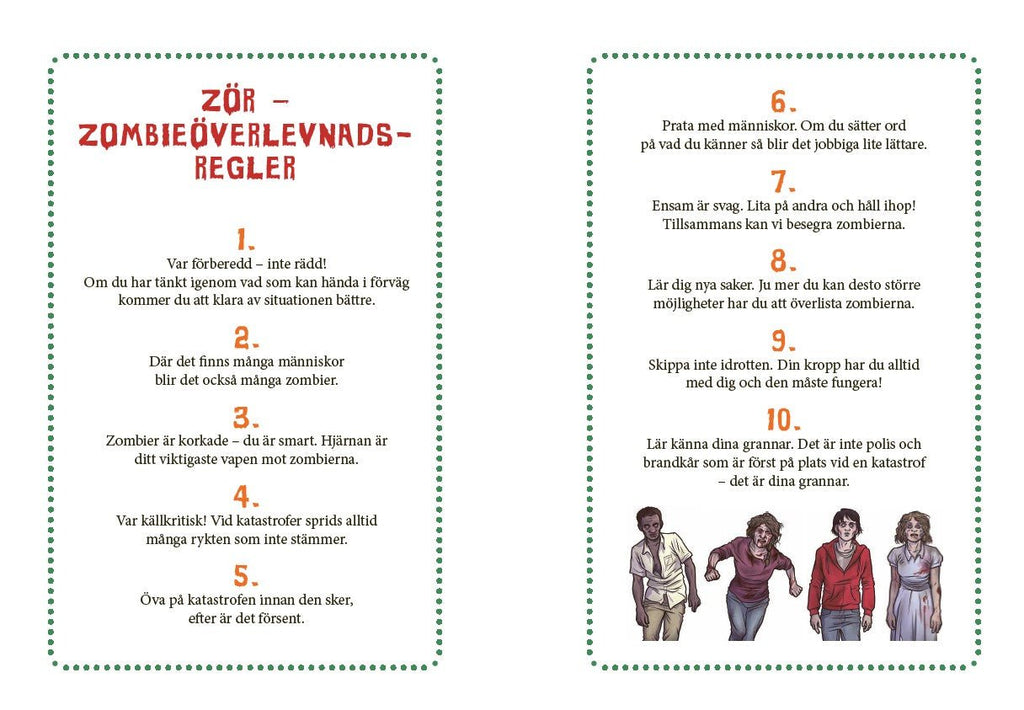Das Buch steckt voller Tipps für die Vorbereitung drinnen und draußen. Hier finden Sie Spiele, praktische Übungen und Gedächtnisregeln, um sich an das zu erinnern, was Sie sich merken sollten. Zum Beispiel eine Grundregel: STOP = Stop, Think, Observe, Plan. Das Wichtigste, was ein Mensch in einer Krisensituation hat, sind nicht diverse Gadgets, sondern das Gehirn! Darüber hinaus finden Sie hier einige Fakten über Zombies. Denn auch wenn es keine echten Zombies gibt, können die Vorbereitungen dadurch unterhaltsamer und weniger gruselig werden.
