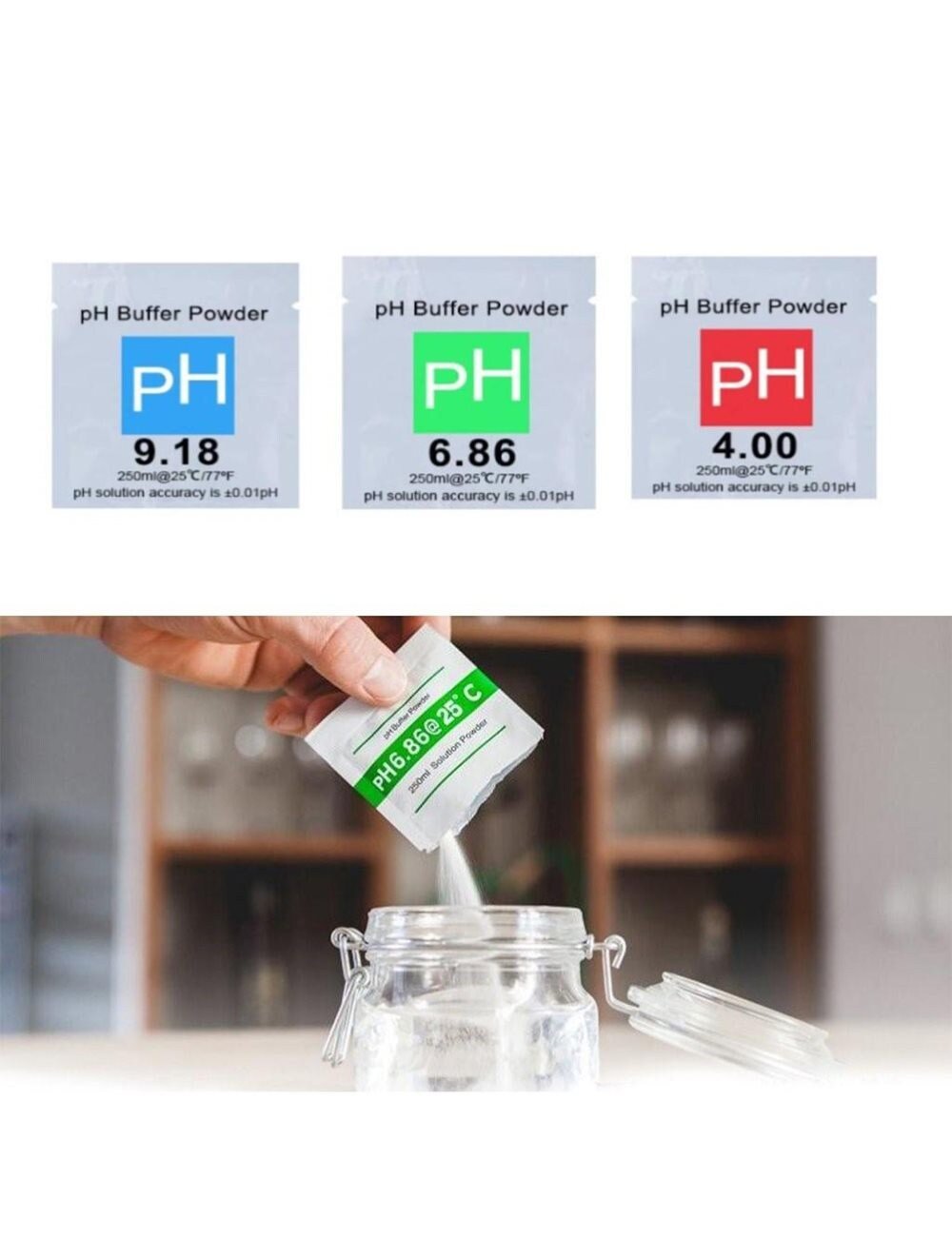 Einfach zu mischen: Um die richtige Pufferlösung herzustellen, geben Sie das Kalibrierungspulver in einen Behälter mit 250 ml destilliertem Wasser, das eine Temperatur von 25 Grad hat. Wenn die Flüssigkeit eine andere Temperatur hat, können Sie den pH-Wert auf dem Beutel ablesen.