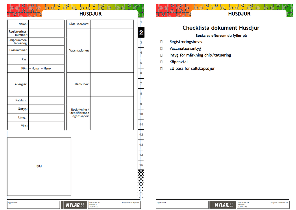 Bild 4 – Beispielformular, dieses ist für Ihre Haustiere. Auf der Vorderseite geben Sie Informationen zu Ihrem Haustier ein, auf der Rückseite finden Sie eine Checkliste der Dokumente, die Sie in den Ordner legen können, Originale oder Kopien, ganz nach Ihrer Wahl.