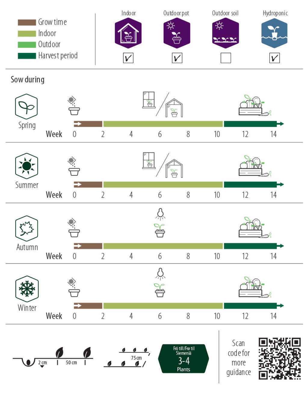Leckere, knackige Minigurke mit glatter Schale, ideal für den Anbau im Gewächshaus, im großen Topf an geschützter Stelle oder als „Gurkenvorhang“ im Haus. Ein Korn/Topf aussäen und bei 25 °C keimen lassen, anschließend bei Zimmertemperatur stehen lassen. Beim Umpflanzen die Pflanze in der gleichen Tiefe wie im Saattopf platzieren, nicht tiefer. Die Pflanze braucht eine Stütze und kann gekappt werden, wenn die gewünschte Höhe erreicht ist. Die Pflanze bildet nur weibliche Blüten und muss nicht bestäubt werden (zu Beginn der Vegetationsperiode können sich jedoch einige männliche Blüten bilden). Oft ernten, die Gurken nicht zu groß werden lassen.