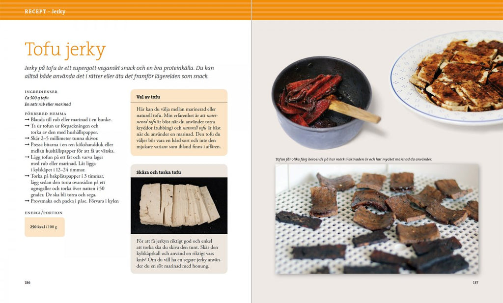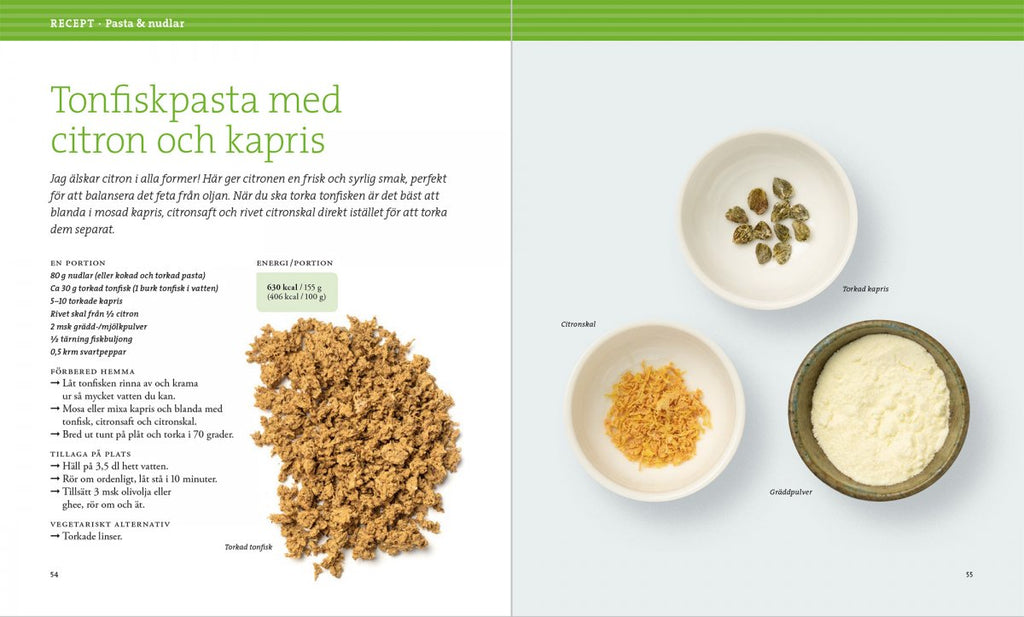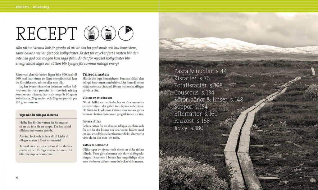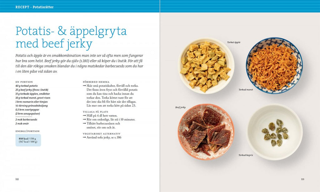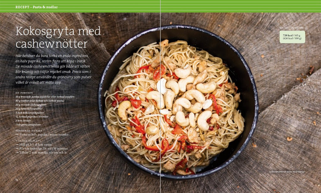 Dieses Kochbuch enthält 90 Rezepte für superschnelles Outdoor-Essen (70 davon lassen sich problemlos komplett vegetarisch zubereiten). Sie bereiten jedes Gericht zu Hause zu und verpacken es in Portionsbeutel. Die Zubereitung des Essens dauert unterwegs dann nicht länger als zehn Minuten, man gibt lediglich heißes Wasser hinzu und rührt um.