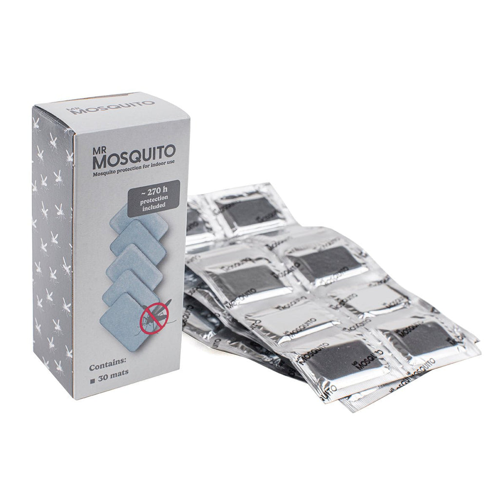 Täyttö Mr Mosquito 230V:lle ja USB-C:lle. Sisältää 30 aktiivista mattoa, joiden kesto on 8–10 tuntia, jopa 300 tuntia hyttyskarkotusta.