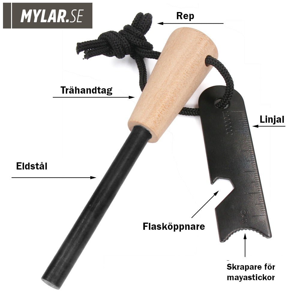 Det yttersta svarta lagret är en skyddande beläggning som skavs bort när du använder eldstålet. Detta eldstål ger en kraftig skur av gnistor som är 300 grader varma vilket gör det lätt att tända med.