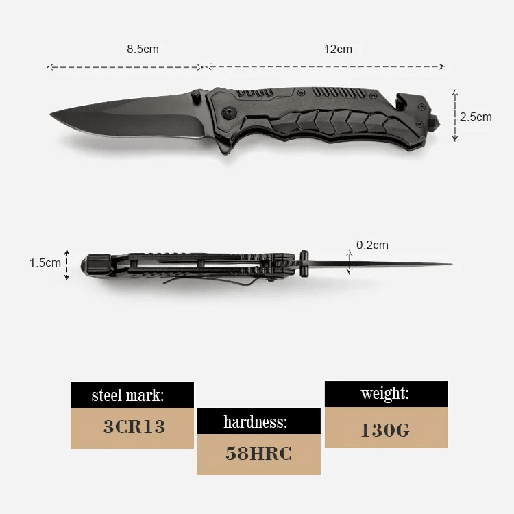 Svartoxiderat blad av rostfritt stål (3Cr13, hårdhet 58HRC) och handtag av aluminium.